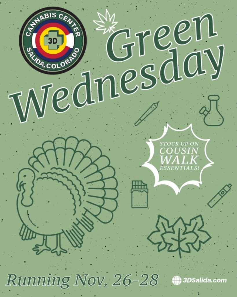 Salida vibes + holiday highs! Green Wednesday is the perfect warm-up for Thanksgiving. Flower, vapes, edibles & more — ready for your celebration. 21+ only. Consume responsibly. #GreenWednesday #3DSalida #StartOnAHigh #RockyMountainVibes #ThanksgivingDaze #CousinWalks #VibeySalidaRead More Nov 26, 2025