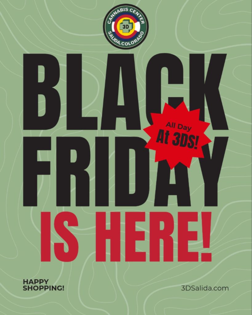 Black Friday is looking extra dank in Salida today! Cruise into 3D Salida for deals that’ll keep your stash happy and your vibes high (responsibly, of course ) In-store only, while supplies last. Must be 21+ with valid ID #3DSalida #BlackFridayVibes #CannabisCommunity #CannabisColorado #RockyMountainHighRead More Nov 28, 2025