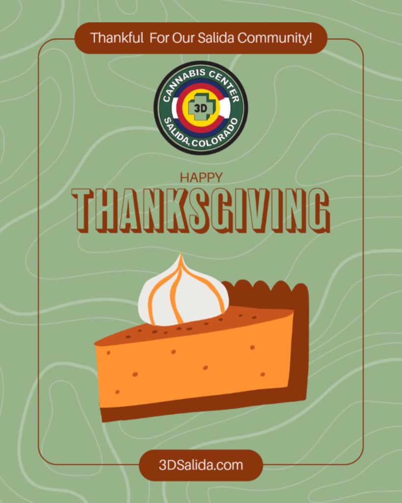 🦃 Gobble, gobble Salida! We hope you had a happy and healthy holiday filled with good vibes and great company Now it’s time to trade turkey for treats — we can’t wait to see you tomorrow for Black Friday fun! 21+ only. Please consume responsibly. #HappyThanksgiving #3DSalida #Grateful #ColoradoCannabis #SalidaCORead More Nov 27, 2025